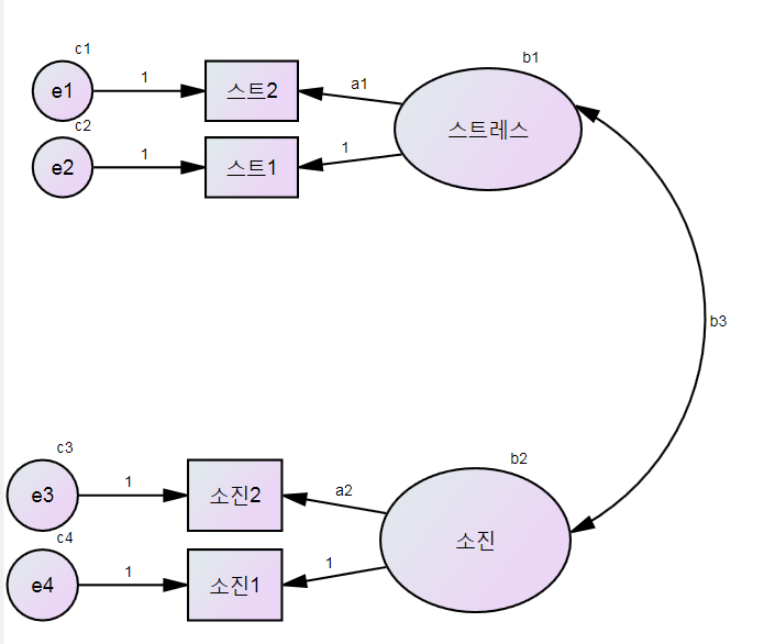스트레스가 소진에 영향을 미치는지 검증한다고 보죠. 그래서 스트레스 측정을 위해 스트1, 스트2, 소진 측정을 위해 소진1, 소진2 설문문항을 만들어 설문조사를 했다고 하죠.