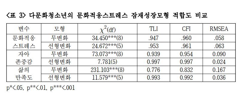문화적응스트레스와 삶의 만족도에서 선형변화모형 M1의 카이제곱 값은 유의적으로 나왔습니다. 즉, 좀 더 복잡한 모형을 추구하라는 이야기죠. 따라서 이차변화모형 M2까지도 고려해야 한다는 것입니다. 그러나 그렇게 안했죠. 이 논문에서도 이 카이제곱 해석을 하지 않았습니다.