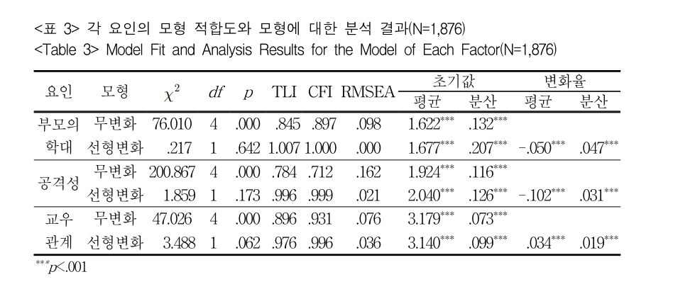 이 가설을 검증하는 것입니다. 따라 부모 학대의 경우 무변화는 카이제곱 검증이 유의적으로 나왔기 때문에 더 복잡한 모형을 선택하는 것이 좋다고 나왔지만(카이제곱=76.010***) 선형변화에서 카이제곱은 유의하지 않아(카이제곱=0.217, p>.05)로 나왔기 때문에 더 복잡한 모형으로 하지 말고 현재 모형인 선형모형 M1이 좋다는 이야기입니다. 밑에 공격성, 교우관계도 같은 해석이 되고요.