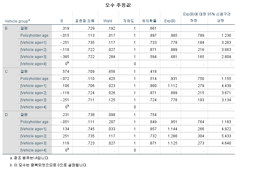 마지막 하단의 D는 첫 번째 범주인 A와 마지막 범주인 D와의 이진 로지스틱 결과물입니다.